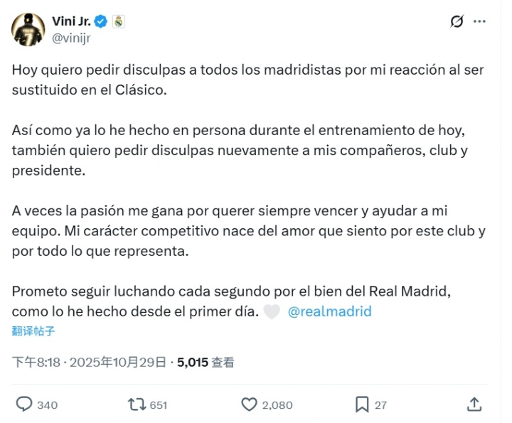 Cầu thủ chạy cánh của Real Madrid, Vinicius đã đưa ra tuyên bố xin lỗi trên mạng xã hội, xin lỗi người hâm mộ, đồng đội, đội bóng và chủ tịch câu lạc bộ vì hành vi gây tranh cãi khi bị thay ra trong trận derby quốc gia. Lời xin lỗi không đề cập tới HLV Alonso.