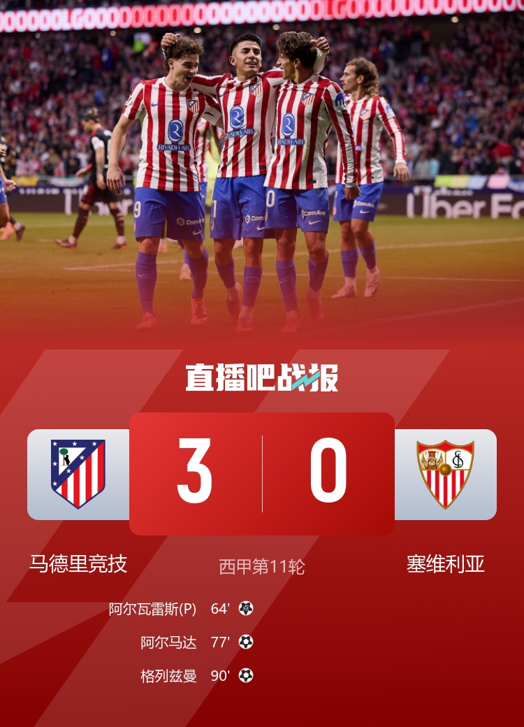 Alvarez thực hiện quả đá phạt đền, Almada ghi bàn và Grizmann ghi bàn. Chung cuộc, Atletico Madrid đánh bại Sevilla với tỷ số 3-0.