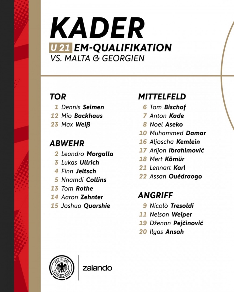 U21 Đức công bố danh sách cầu thủ mới, bao gồm Karl, Bischoff và Ibrahimovic. U21 Đức sẽ gặp U21 Malta và U21 Georgia ở vòng loại U21 Cúp C1 châu Âu.
